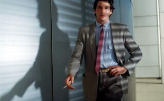- タンカラーのスーツ。80年代前半に流行したスタイルで、ノッチラペル。低めの2つのフロントボタン、ダブルベンツ、ローライズ・トラウザー