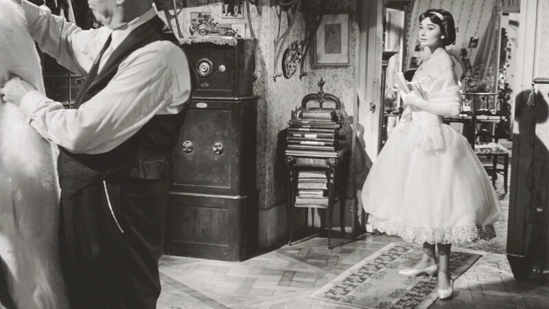 このカクテルドレスこそは、本作撮影時(1956年8月~12月)に27歳だったオードリー・ヘプバーンと29歳のユベール・ド・ジバンシィが到達したひとつの頂点とも言える作品でした。