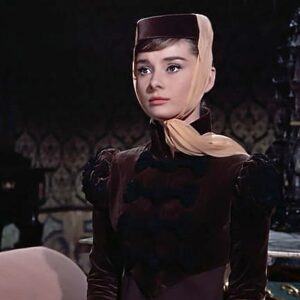 オードリーの頭を覆う、サンドベージュ色のヘッドスカーフの花柄がとても美しいです。横に流した前髪の出し方が絶妙です。