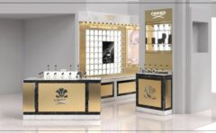 エンパイアグリーンとシェンナブラウンの二色のみで形成される、重厚なバルベンソン大理石のカウンターと木製キャビネットで生み出された室内の潔さが、陳列されている様々なビュリーの香りの商品に、規律と生命の躍動を与えているようです。