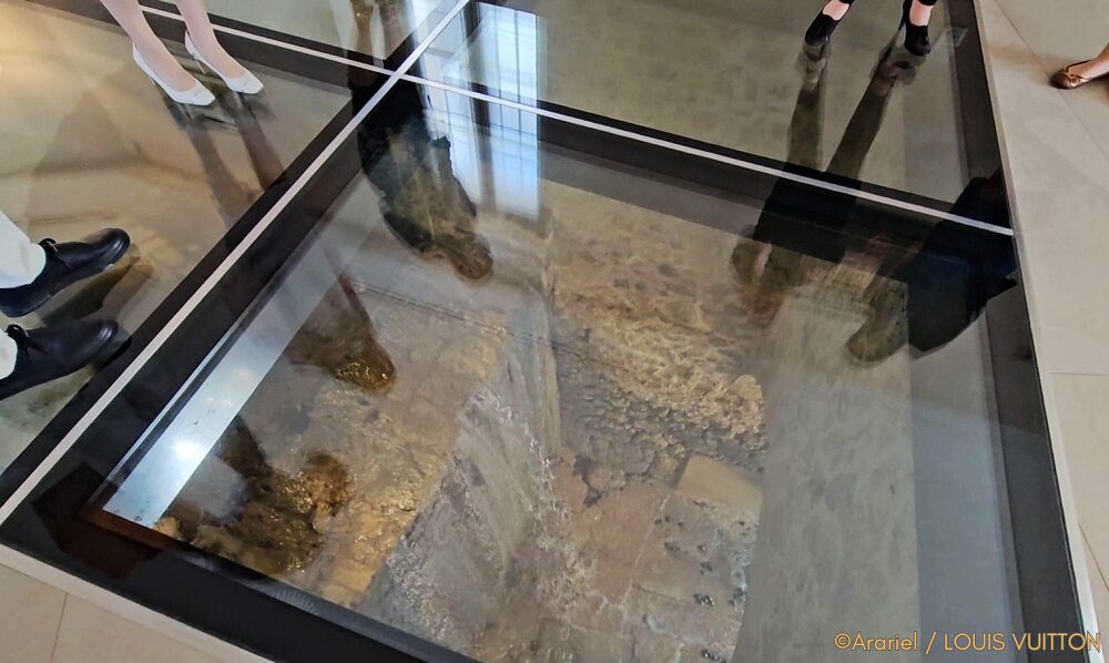 奥にある陳列棚の中に、100年以上前のルイ・ヴィトンの香水瓶が陳列されています。