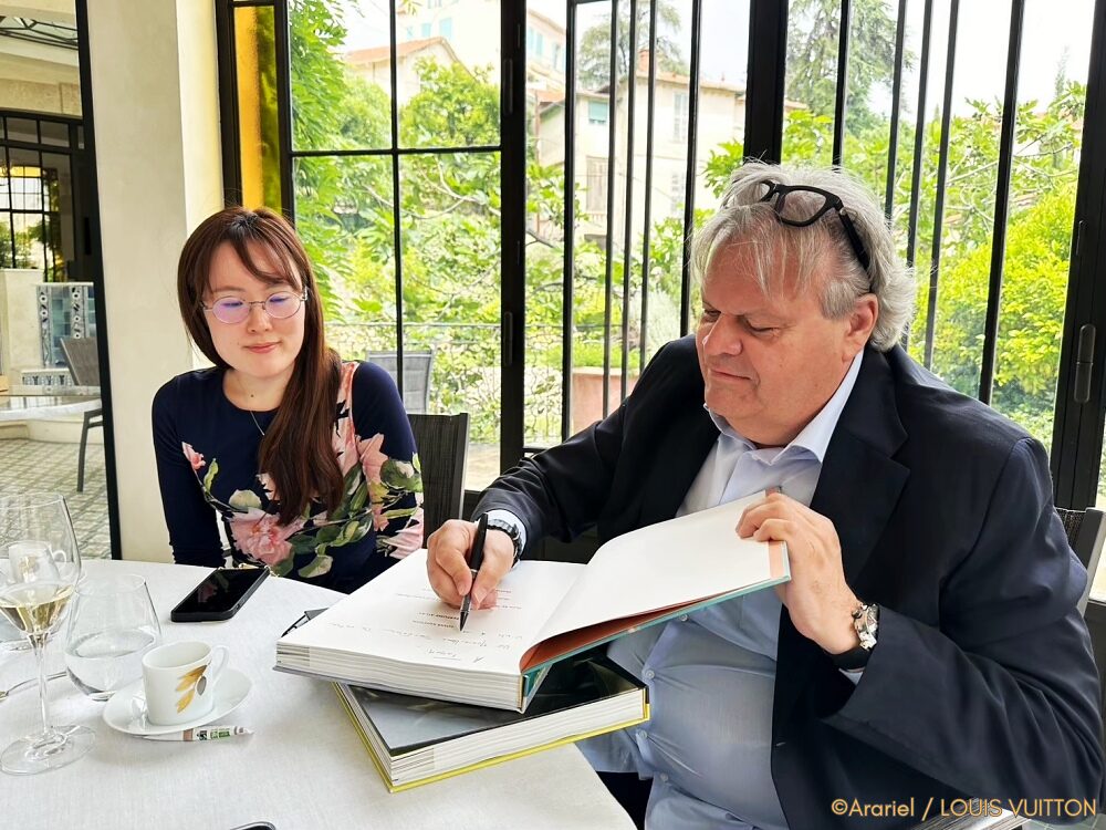 『Louis Vuitton: a Perfume Atlas』にサインをするジャック・キャヴァリエさん。