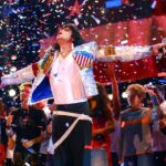 左のコスチュームは「ヒール・ザ・ワールド」のコスチュームです。曲に合わせてグローバルな感じを出すために、世界中のビーズが取り入れられています。さらに世界中のブレスレットもスリーブ部分に組み込まれています。右肩には中国の刺繍、左肩にはインドの宝石をあしらった刺繍、左わき腹にはネイティブ・アメリカンのパッチワークをレザーで再現している。右わき腹にはアラビア語で世界を癒そうと書かれている。それでいて、ハイネックの効果により、ミリタリーなテイストを醸し出すジャケット。