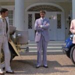 ギャツビーの大邸宅をバックにオールホワイトスタイルのレッドフォード。
