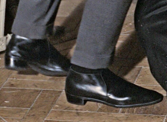 - かなり厚手のミッドグレーフランネル素材、3ピーススーツ、シングル、2ボタン、スリムノッチラペル、ノーベント。ストレートカットの裾を持つ6ボタンベスト(ウエストコート)。サイドアジャスターのトラウザー